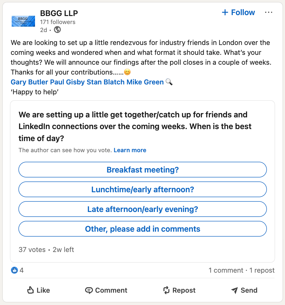 Polls ideally have one clear and concise question and they run for one week before they close. It’s also a good idea to include an Other option that prompts people to comment below, which can drive conversation.