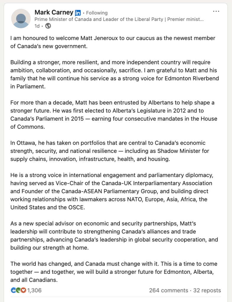 Consider this LinkedIn post from Prime Minister of Canada and Leader of the Liberal Party Mark Carney’s LinkedIn page.