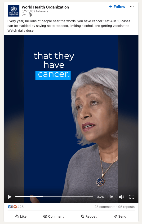 Video posts on LinkedIn earn 3 times more engagement than text posts. For mission-driven organizations and public sector communications, awareness and engagement are essential. Consider the following example from the World Health Organization.