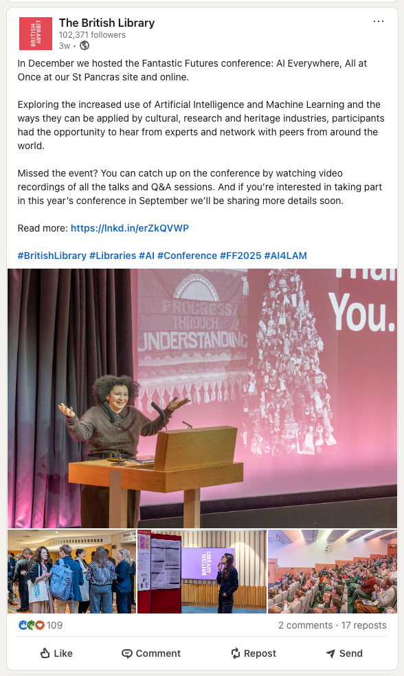Another option for LinkedIn posts is static images, particularly multiple images shared as a gallery. This is useful for when you want to impart a feeling on your audience. This could be a feeling of community, missing out, or a sense of anticipation. Posts that are highlighting company culture, launching a product, or sharing photos of a recent event (often to promote an upcoming one!) are great candidates for the single or multi-image format. Consider the below post from The British Library.